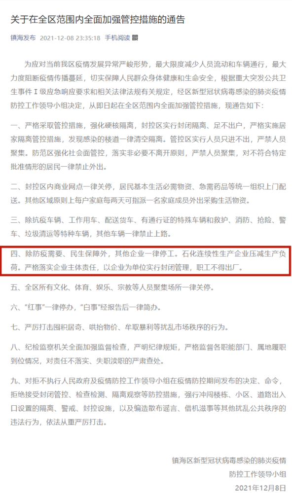 浙江宁波:宁波镇海决定在全区范围内全面升级管控措施,除防疫需要、民生保障外,其他企业一律停工,石化连续性生产企业压减生产负荷。严格落实企业主体责任,以企业为单位实行封闭管理,职工不得出厂。搜索微信公众号“荆楚通讯”,看更多好文!