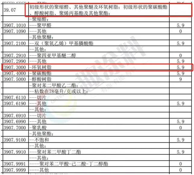 税则号列3907.3000,货品名称-环氧树脂,协定税率5.9;