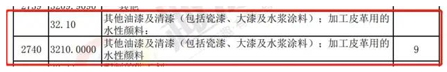 序号2740,税则号列3210.0000,货品名称其他油漆及清漆(包括瓷漆、大漆及水浆涂料);加工皮革用的水性颜料,协定税率9;