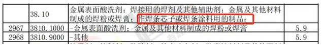 序号2967,税则号列3810.1000,货品名称-金属表面酸洗剂;金属及其他材料制成的焊粉或焊膏,协定税率5.9;