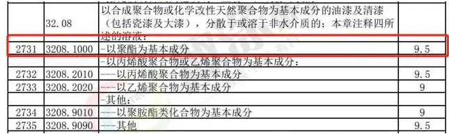 序号2731,税则号列3208.1000,货品名称-以聚酯为基本成分,协定税率9.5;