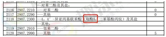 序号2118,税则号列2907.2300,货品名称--4,4′-异亚丙基联苯酚(双酚A,二苯基酚丙烷)及其盐,协定税率无;