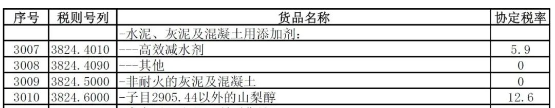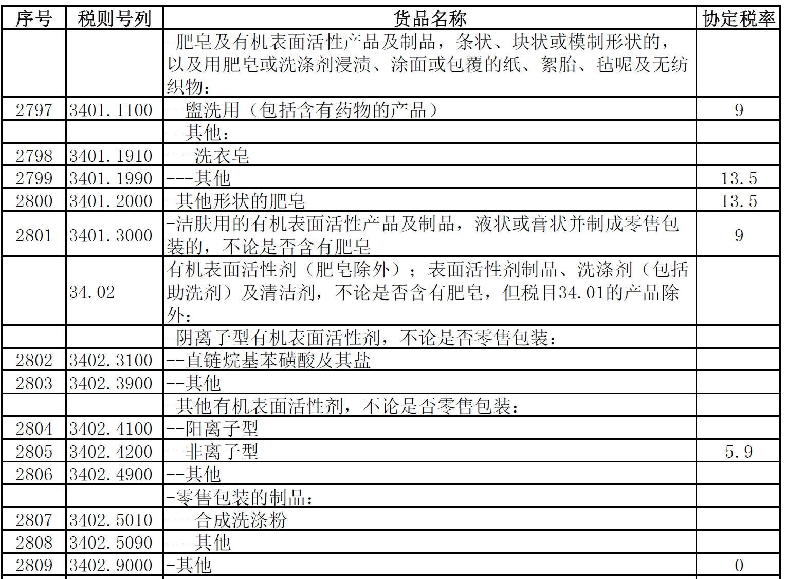 除此之外,环氧乙烷协定关税为5%,高效减水剂的协定关税为5.9%,洁肤用的有机表面活性产品及制品,液状或膏状并制成零售包装不论是否含有肥皂的协定关税为9%,其他非离子型表面活性剂的协定关税为5.9%等。