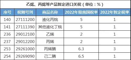 其中针对液化丙烷、液化丁烷、乙烯、丙烯、丙烯腈、己二腈等,可以看到2022年暂定进口税率均大幅低于最惠国税率,除丙烯腈进口税率调至3%以外,其他5大类产品税率均调至1%。