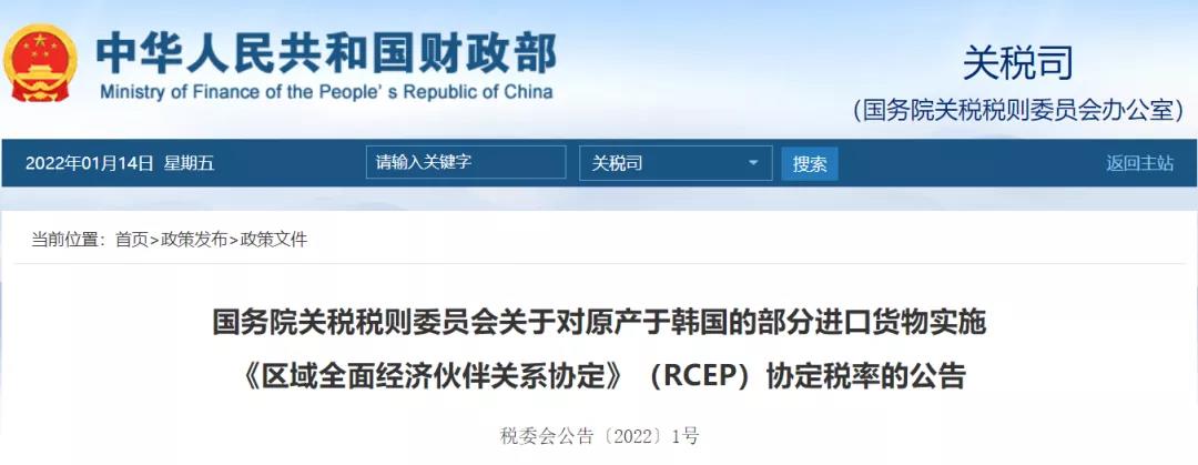 1月13日,根据《中华人民共和国进出口关税条例》和《区域全面经济伙伴关系协定》(RCEP)有关规定,以及RCEP对韩国生效情况,自2022年2月1日起,中国对原产于韩国的部分进口货物实施RCEP协定税率。