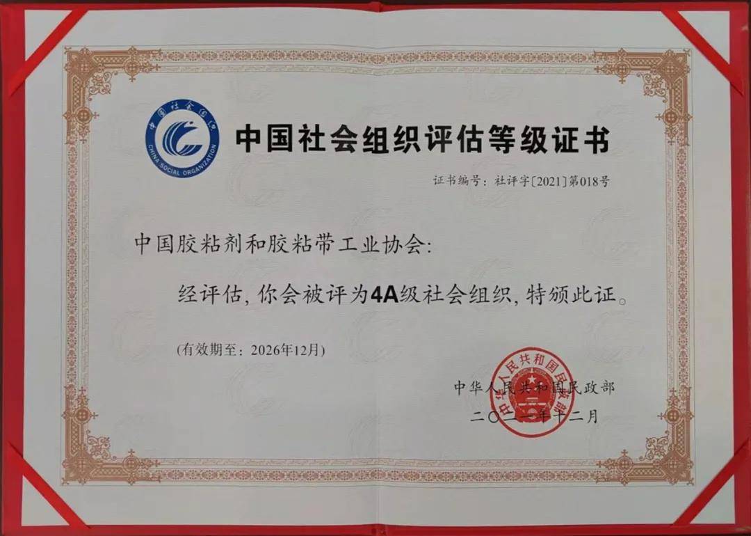 近日,民政部正式发布公告(2021年第519号文)和中国社会组织评估等级证书(社评字[2021]第018号),中国胶粘剂和胶粘带工业协会在民政部组织开展的2020年度全国性社会组织等级评估工作中,被评为4A级社会组织(有效期:2021年12月-2026年12月)。这是中国胶粘剂和胶粘带工业协会继2009年、2015年被评为4A级社会组织以来,连续第三次获此殊荣。