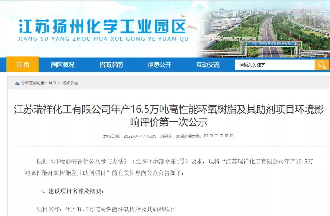 1月17日,江苏扬州化工园发布了“江苏瑞祥化工有限公司年产16.5万吨高性能环氧树脂及其助剂项目”环境影响评价第一次公示,项目概况如下: