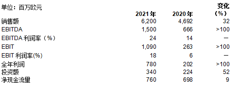 受上述因素影响,息税前利润(EBIT)得以增至约10.9亿欧元(2020年:2.63亿欧元)。折旧和摊销约计4亿欧元(2020年:4.04亿欧元),与上年基本持平。2021全年利润约计7.80亿欧元(2020年:2.02亿欧元)。