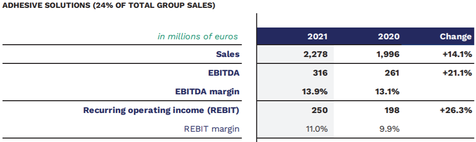 可见,胶粘剂事业部的2021年销售额占了阿科玛集团的24%,为22.78亿欧元(人民币超160亿),比2020年(19,96欧元)增长了14.1%!具体业务量如下所示: