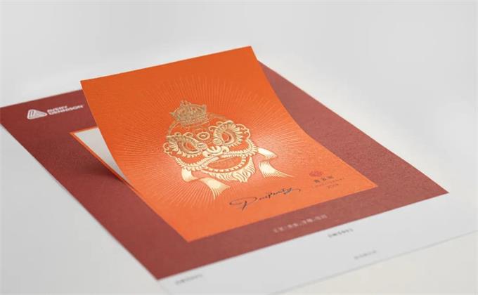 “舞狮”酒标使用极地雅白纸,纹路细腻。狮子图案运用烫金、浮雕和压凹工艺,栩栩如生。标签以喜庆的橙色调搭配雅黑瓶身,带来视觉冲击感,端庄大方。