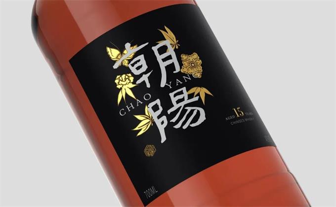 “花开富贵”酒标选用黑色亚光纸,画面上“朝阳”两字以书法效果呈现,蝴蝶点缀于花朵中,用烫金浮雕的工艺展示,低调不失尊贵,酒瓶瓶体线条流畅圆润,尽显奢华之感。