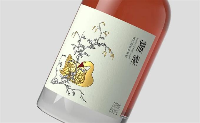 酒标选用大地纹雅黄纸,精致素雅,营造出秋天恬淡的感觉。肥鸭与湖畔秋草相依,鸭子图案采用浮雕烫金工艺,材料本身丝状纹路又有细腻触感,使整个画面充满层次。