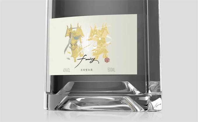 酒标材料选用了亮银PET覆纸,恰到好处的光泽感使视觉上更加现代新潮,配以简洁硬朗的观云酒瓶,彰显“神”的威严,结合浮雕、烫金和UV工艺,使门神形象更加立体丰满。