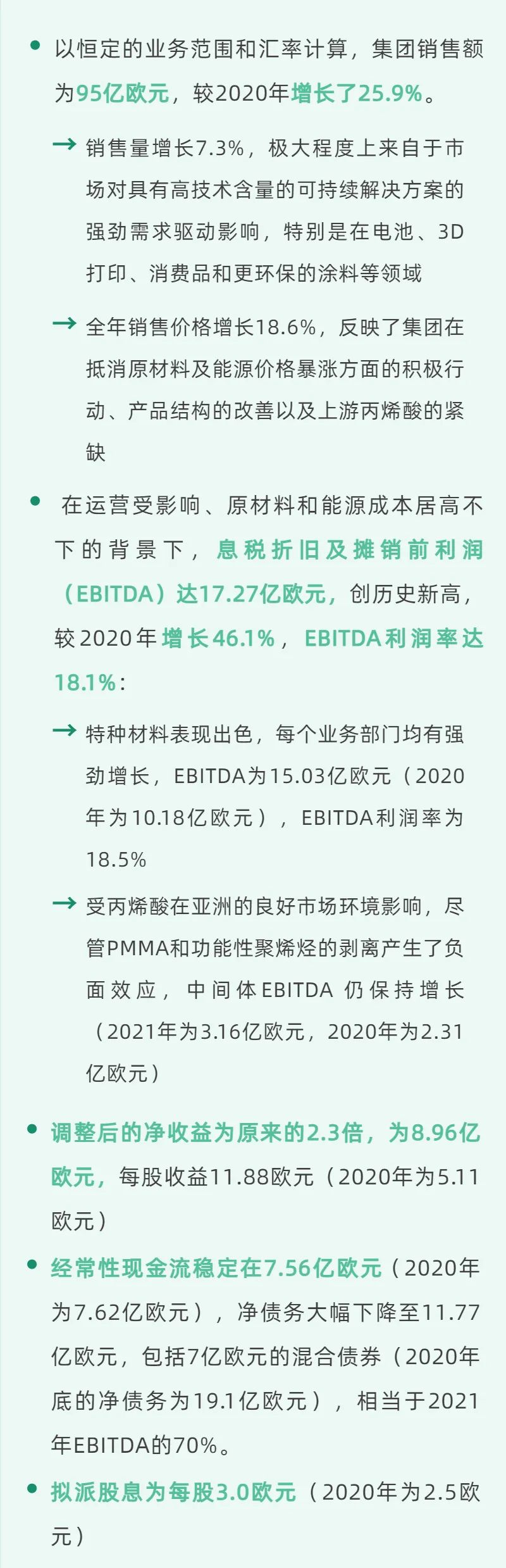 随着PMMA剥离的完成和对亚什兰高性能胶粘剂业务的拟收购,集团在重新聚焦于特种材料的战略上迈出了重要步伐,特种材料占2021年预计销售额的近90%