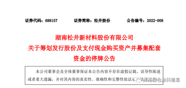 近日,松井股份发布公告称,公司正在筹划以发行股份及支付现金的方式购买广东锐涂精细化工有限公司70%左右的股权,同时,公司拟向不超过35名特定投资者非公开发行股份募集配套资金,发行股份募集配套资金规模预计不超过人民币5000万元。因本次交易涉及发行股份购买资产事宜,需按照重大资产重组履行相关程序。鉴于相关事项尚存在不确定性,为保证公平信息披露,维护投资者利益,避免造成公司股价异常波动。