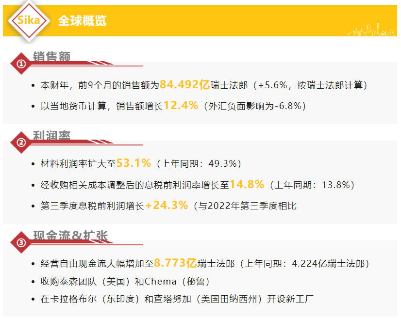 10月23日,西卡集团发布三季报。即使在充满挑战的经济和地缘政治环境中,西卡在2023财年的前九个月依旧表现良好。 尽管利率急剧上升,对建筑业产生了相应的负面影响,但西卡的销售额仍上升至84.492亿瑞士法郎(折合人民币约690亿)。