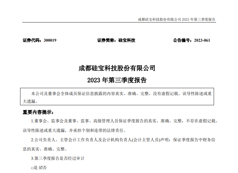 10月18日晚间,硅宝科技(300019.SZ)发布2023年第三季度业绩报告。