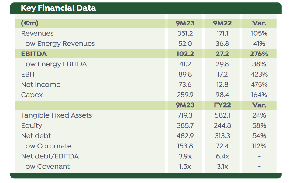 Grenergy成立于2007年,主营光伏及储能业务,目前在11个国家拥有超15GW光伏和10GWh储能的项目。受益于近年来欧洲能源需求高涨及绿电政策普及,Grenergy业务版图迅速扩张。据2023年三季报显示,报告期内公司在西班牙、智利等多国签署合计达1.5GW的购电协议。业绩方面,公司2023年前三季度收入3.51亿欧元,同比增长105%;其中EBITDA 1.02亿欧元,同比增长276%。