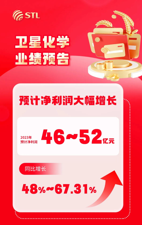 1月23日,卫星化学发布2023年度业绩预告。根据预告内容显示,2023年卫星化学净利润预计46-52亿元,同比增长48%-67.31%。