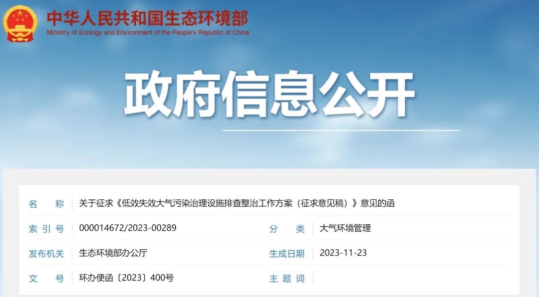 2023年11月,生态环境部办公厅发布《低效失效大气污染治理设施排查整治工作方案(征求意见稿)》(以下简称方案),要求全面开展低效失效大气污染治理设施排查整治工作,建立排查整治清单,“淘汰一批、整治一批、提升一批”。