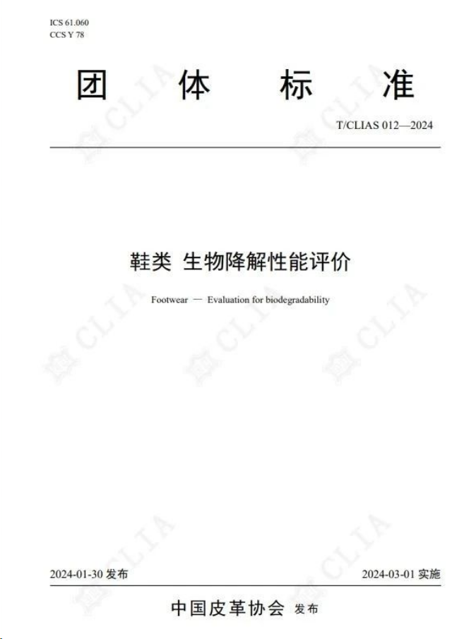 1月30日,《鞋类 生物降解性能评价》团体标准正式发布,标准号T/CLIAS 012-2024。该标准规定了鞋类生物降解性能的术语和定义、要求、试验方法、标识及判定规则,适用于成品鞋的生物降解性能的评价,鞋用材料的生物降解性能评价可参照执行。