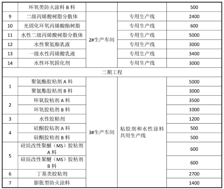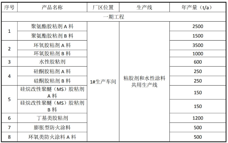 建设内容及规模:本项目建设分二期,一期生产胶粘剂、合成树脂、固化剂及防火涂料 30000 吨,其中粘胶剂、防火涂料年产生产 12600t/a,水性合成树脂及固化剂 17400/a; 二期生产胶粘剂和防火涂料 20000t/a。产品方案如下: