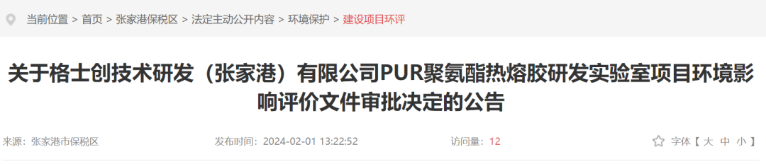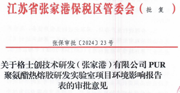 格士创技术研发(张家港)有限公司是一家从事工程发展、技术研究、试验 发展等业务的公司,成立于2022年12月16日,本次拟投资300万,在江苏省张家港保税区科技创业园B幢540室建设PUR聚氨酯热熔胶研发实验室项目,主要进行 PUR聚氨酯热熔胶的研发。