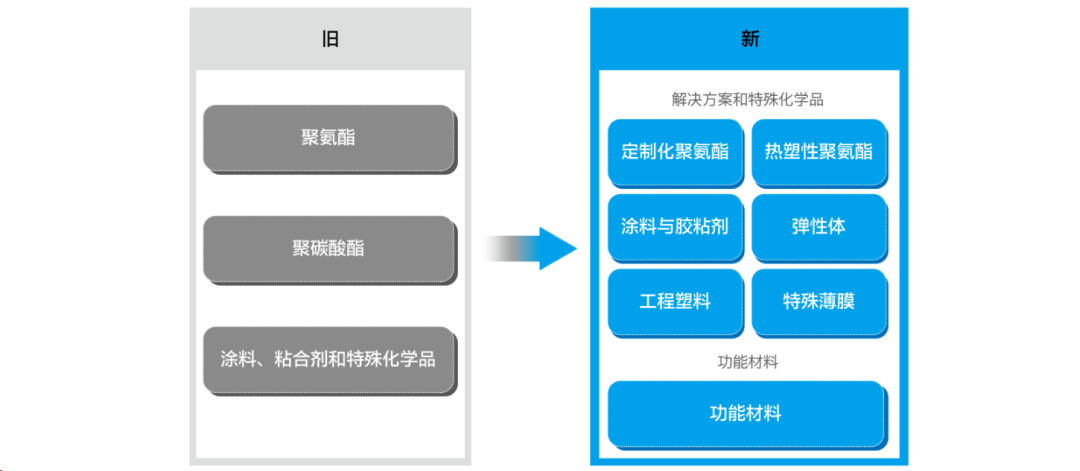 2021年,科思创宣布启动全新集团架构:两大业务板块(“解决方案和特殊化学品”和“功能材料”)、七大事业部,后者隶属于前者。