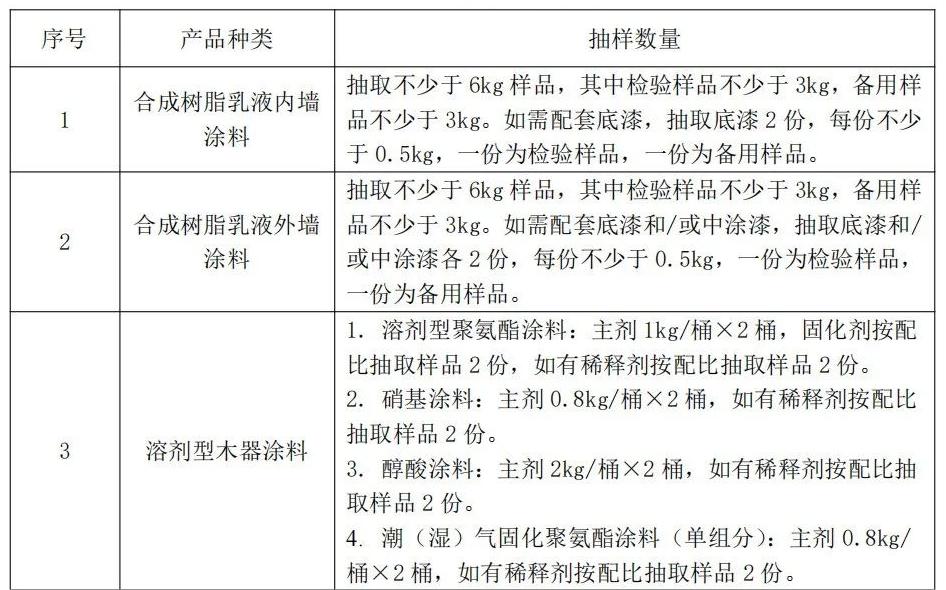 抽查产品种类包括合成树脂乳液内墙涂料、合成树脂乳液外墙涂料、溶剂型木器涂料、建筑防水涂料、工业防护涂料、路面标线涂料。