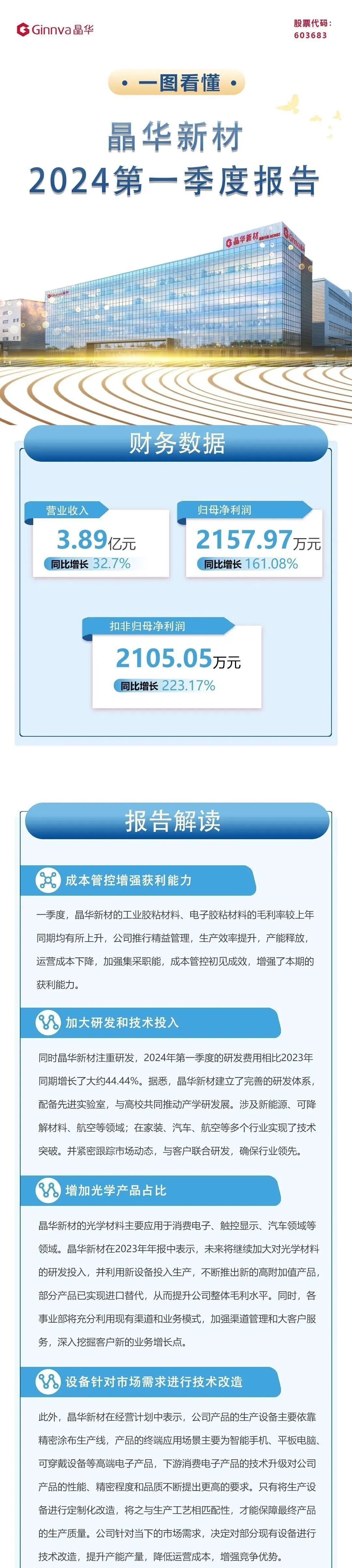 2023年全年,晶华新材实现营业收入15.59亿元,比上年同期增长10.23%;归属于母公司的净利润5656.89万元,比上年同期增长872.76%。晶华新材2024年第一季度报告如下图所示: