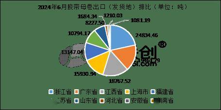 按照胶带母卷的发货地来分析。2024年6月份,中国胶带母卷发货地排比中,浙江省出口量居首位,其出口量为24834.46吨,占比20.42%;其次为广东省,出口量为19461.79吨,占比16.01%;位于第三位的是江西省,其出口量为18767.52吨,占比15.43%。