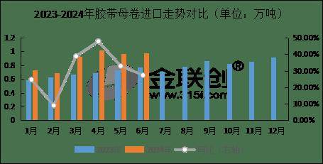 根据海关总署数据统计,2024年6月进口胶带母卷0.98万吨,环比增加0.99%,同比增加26.76%。