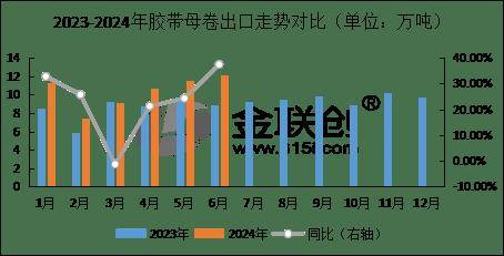 根据海关总署数据统计,2024年6月出口胶带母卷12.16万吨,环比增加4.89%,同比增加37.37%。