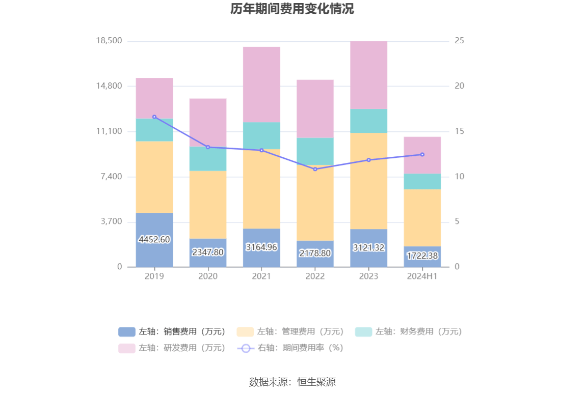 2024年上半年,公司期间费用为1.07亿元,较上年同期增加2853.05万元;期间费用率为12.47%,较上年同期上升0.69个百分点。其中,销售费用同比增长41.93%,管理费用同比增长44.56%,研发费用同比增长42.73%,财务费用同比增长0.48%。