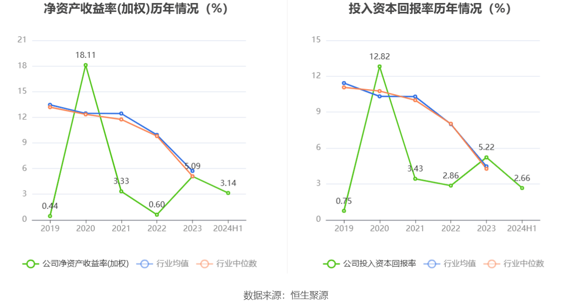 数据显示,2024年上半年公司加权平均净资产收益率为3.14%,较上年同期增长1.64个百分点;公司2024年上半年投入资本回报率为2.66%,较上年同期增长0.56个百分点。