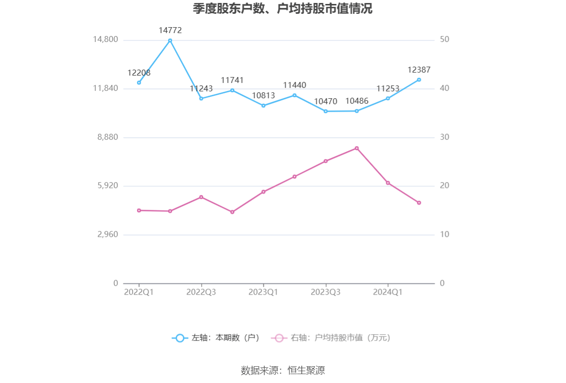 筹码集中度方面,截至2024年上半年末,公司股东总户数为1.24万户,较一季度末增长了1134户,增幅10.08%;户均持股市值由一季度末的20.67万元下降至16.59万元,降幅为19.74%。