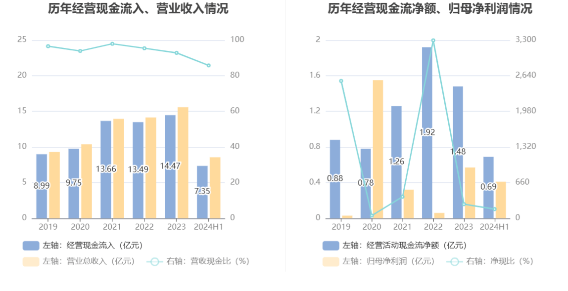 2024年上半年,公司营业收入现金比为85.77%,净现比为169.83%。