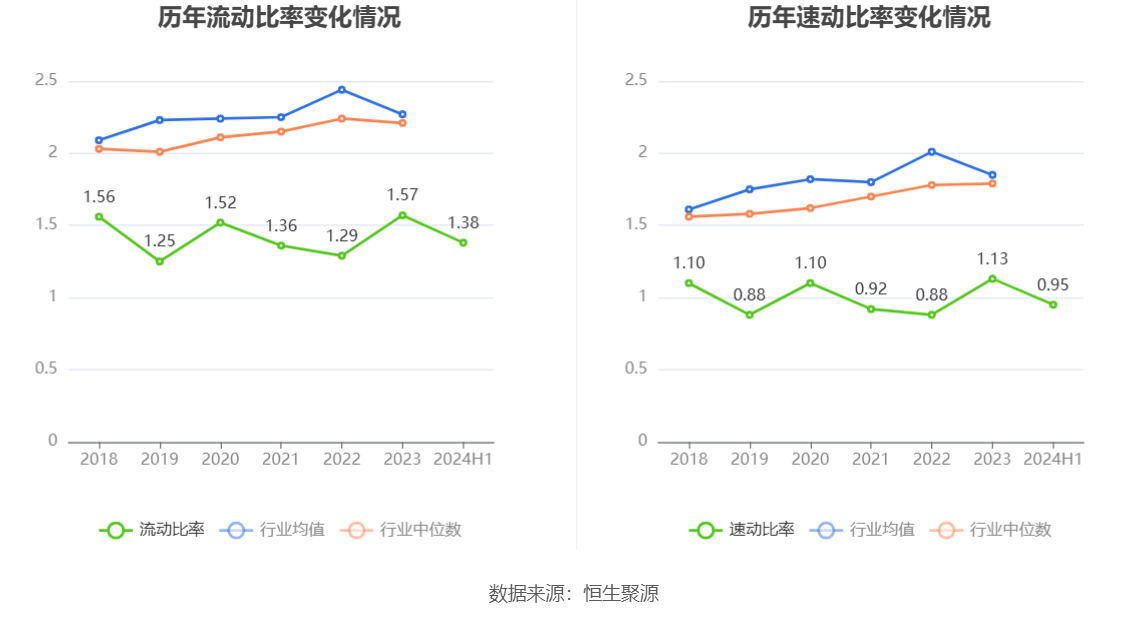 2024年上半年,公司流动比率为1.38,速动比率为0.95。