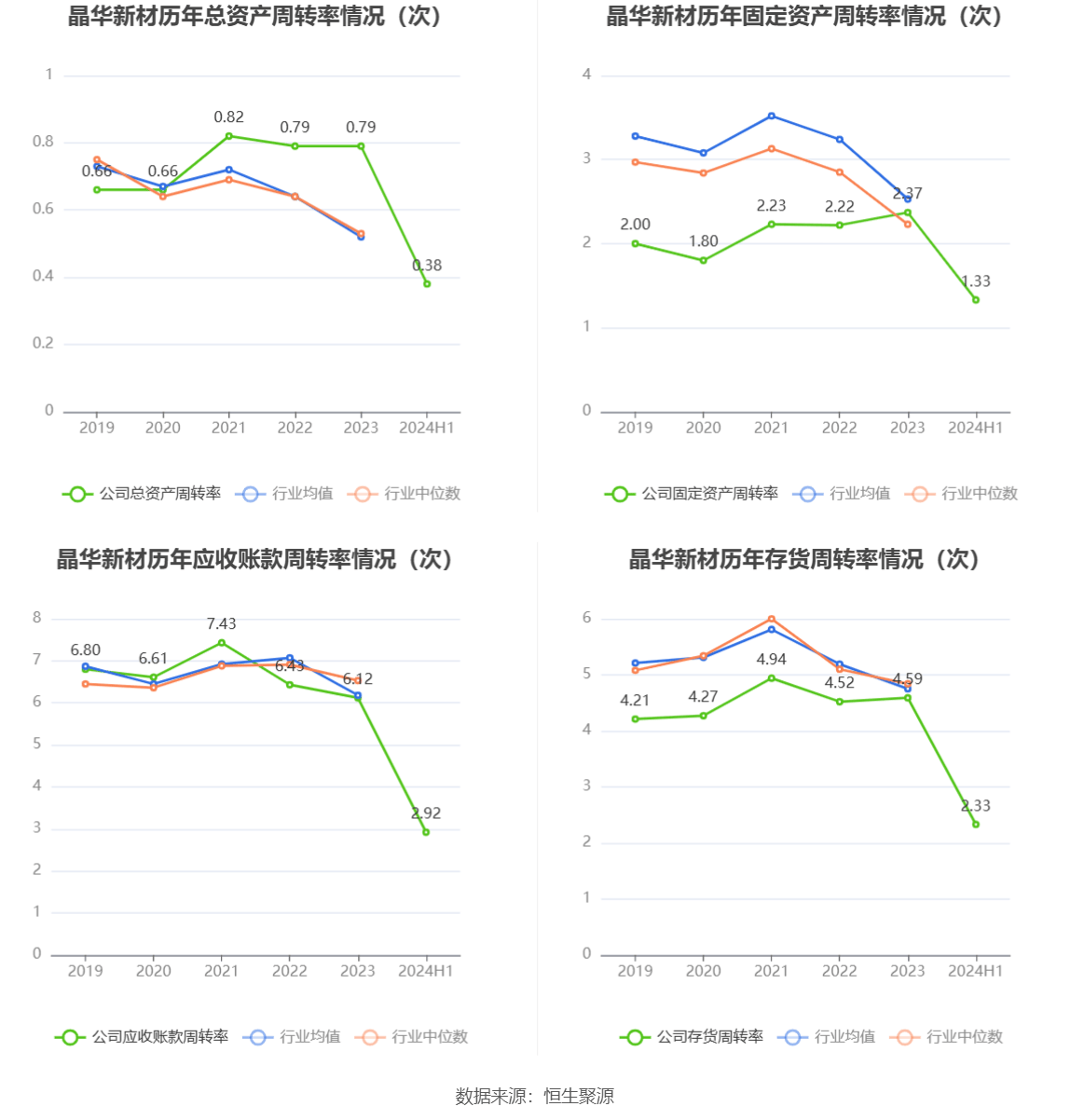 营运能力方面,2024年上半年,公司公司总资产周转率为0.38次,上年同期为0.37次(2023年上半年行业平均值为0.26次,公司位居同行业42/170);固定资产周转率为1.33次,上年同期为1.01次(2023年上半年行业平均值为1.28次,公司位居同行业93/170);公司应收账款周转率、存货周转率分别为2.92次、2.33次。