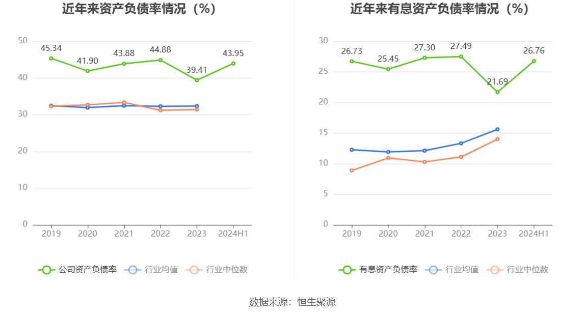 在偿债能力方面,公司2024年上半年末资产负债率为43.95%,相比上年末上升4.54个百分点;有息资产负债率为26.76%,相比上年末上升5.07个百分点。