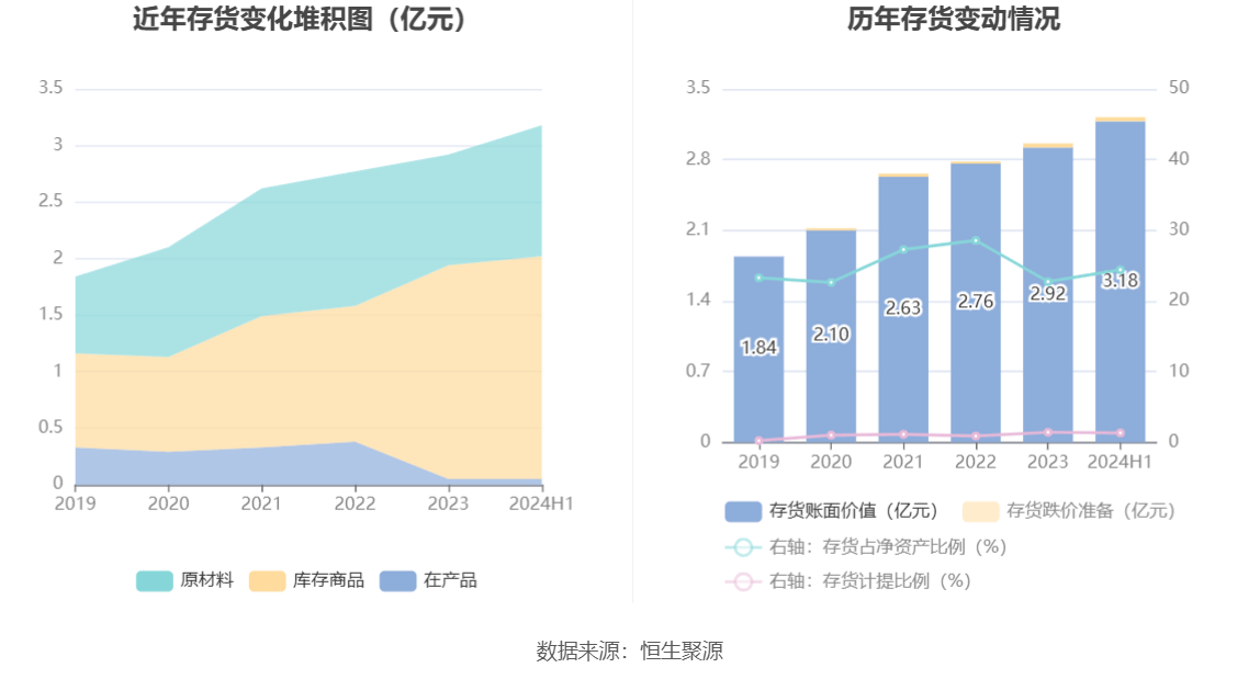 从存货变动来看,截至2024年上半年末,公司存货账面价值为3.18亿元,占净资产的24.41%,较上年末增加2610.07万元。其中,存货跌价准备为428.7万元,计提比例为1.33%。