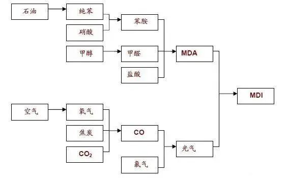 MDI是聚氨酯生产的关键成分,MDI基聚氨酯可用于制造硬质泡沫、软质泡沫、涂料、黏结剂等各种化工产品。MDI来源主要是石化原料,其生产工艺主要有光气化法和非光气化法两种,光气化法更为流行。