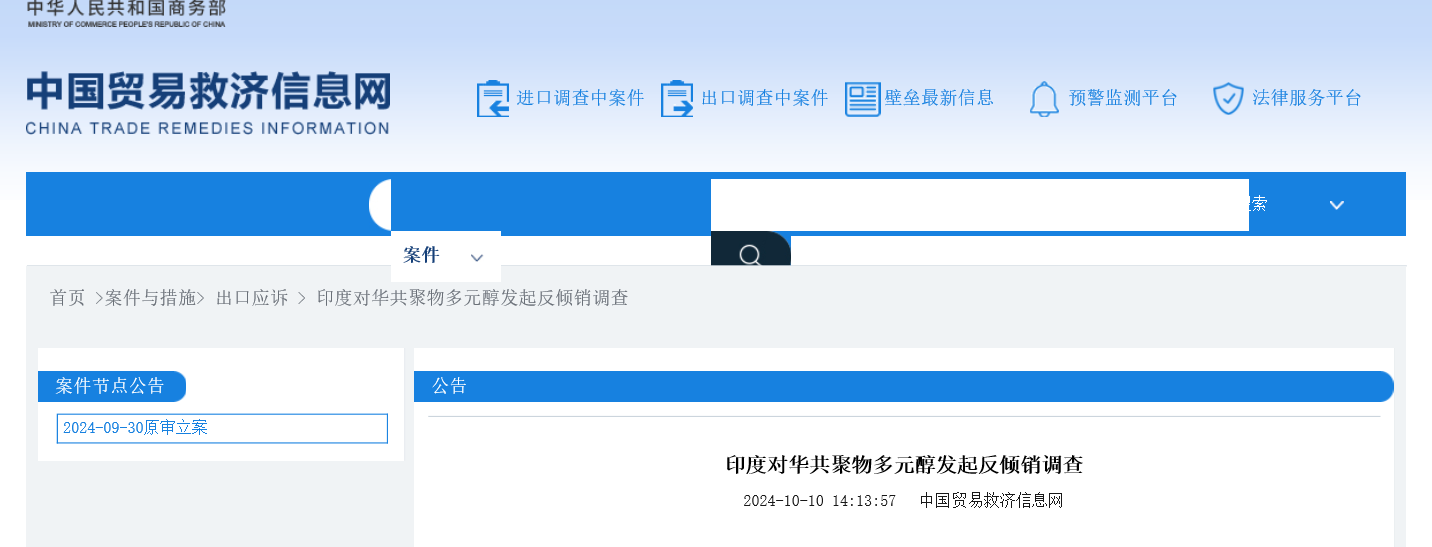 2024年9月30日,印度商工部发布公告称,应印度国内企业Expanded Polymer Systems Pvt. Ltd.提交的申请,对原产于或进口自中国的羟基值大于等于23.5的共聚物多元醇(Copolymer Polyol of hydroxyl value >=23.5)发起反倾销调查。本案涉及印度海关编码39072910和39072990项下的产品。本案倾销调查期为2023年4月1日至2024年3月31日(12个月),损害调查期为2020年4月1日至2021年3月31日、2021年4月1日至2022年3月31日、2022年4月1日至2023年3月31日以及2023年4月1日至2024年3月31日。