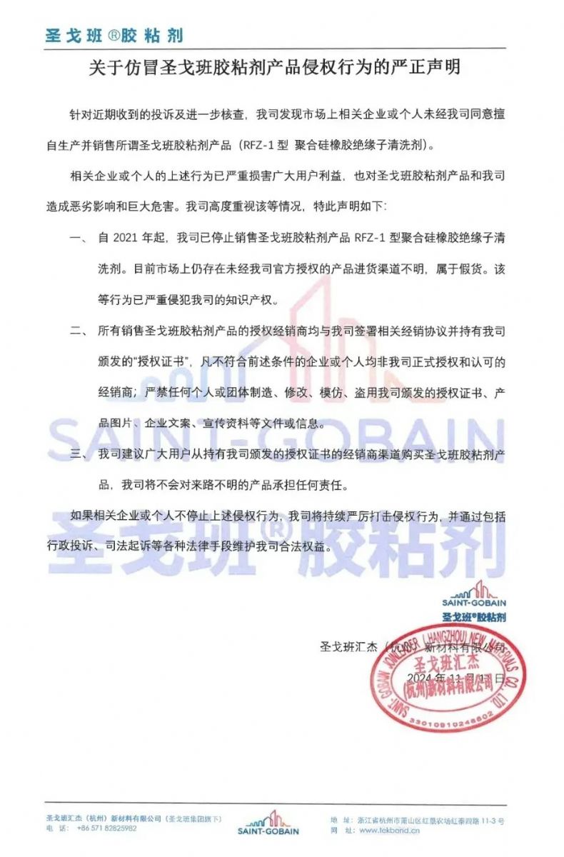 此外,圣戈班汇杰(杭州)新材料有限公司近期也发布了关于仿冒圣戈班胶粘剂产品侵权行为的严正声明: