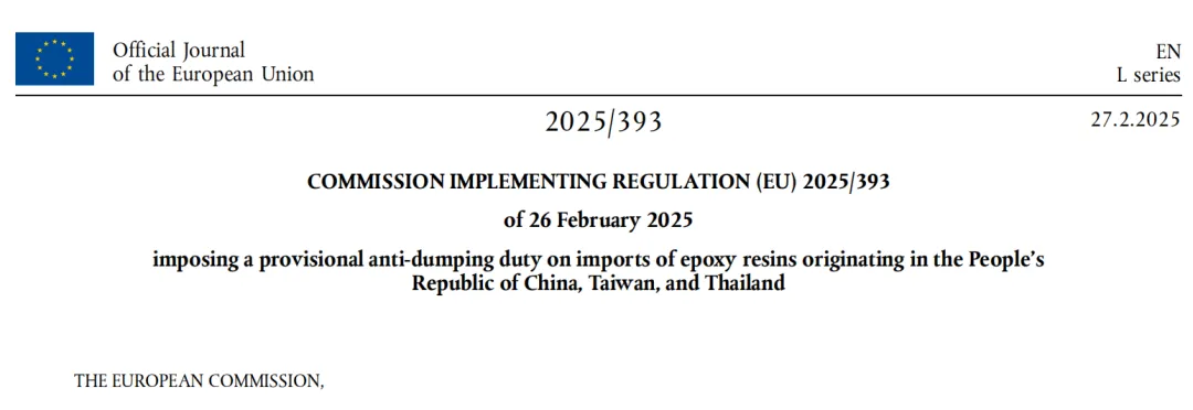 2025年2月27日,欧盟委员会正式公布了《对原产于中华人民共和国、韩国、中国台湾和泰国的进口环氧树脂征收临时反倾销税案件》的初裁公告。