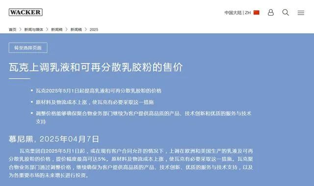 瓦克化学称,自 2025 年 5 月 1 日起,若现有客户合同允许,瓦克将上调其在欧洲和美国生产的乳液及可再分散乳胶粉价格,最高提价幅度可达 5%。这一价格调整背后,原材料及物流成本的持续攀升是主要推动因素。