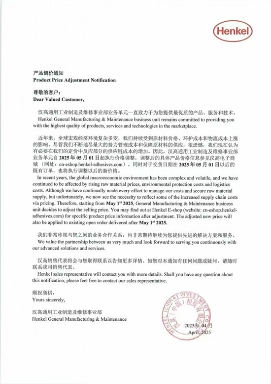 全球胶粘剂行业龙头汉高集团于 4 月 3 日宣布,自 2025 年 5 月 1 日起调整产品价格。这一涨价决定主要源于 “原材料、环保及物流成本持续攀升”,且明确既有订单若交货日期在 5 月 1 日后,也将执行新价格。事实上,早在 2025 年年初,汉高就因宏观经济形势复杂多变、受货币政策影响经济增长放缓、市场面临持续通货膨胀压力、能源价格历史性上涨以及劳动力成本不断上升等因素,对公司产品组合中的选定产品进行了价格调整,于 1 月 10 日生效。此次涨价可能触发相关竞争对手跟进,对下游依赖汉高粘合剂的企业,如汽车制造、电子设备组装等行业,将带来成本激增的挑战。