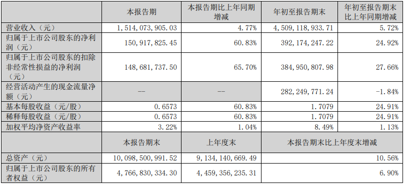 盈利能力表现更为突出,本报告期归属于上市公司股东的净利润1.51亿元,同比大幅增长60.83%;扣除非经常性损益后的净利润1.49亿元,同比增长65.70%。年初至报告期末,累计归母净利润3.92亿元,同比增长24.92%,扣非后累计净利润3.85亿元,同比增长27.66%,盈利质量较高。