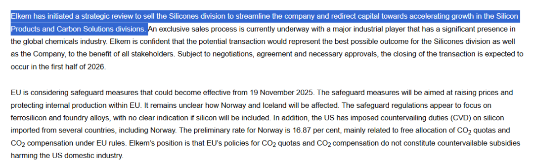 2025年10月23日,埃肯在公布2025年三季度业绩时同步披露,为精简业务架构并优化资源配置,已正式启动有机硅事业部的战略评估与出售程序。该事业部目前已被列入待售资产类别,公司正与一家全球化工行业的工业巨头推进独家销售流程,预计交易将于2026年上半年完成。
