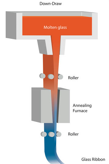 肖特玻璃厂为了生产轻薄有强韧的玻璃——25微米,比人类的发丝还细——这家公司直接从大缸中将玻璃吸熔出来,当时它们还尚未冷却。(如示意图显示)